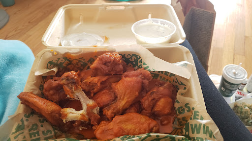 I think these are the best wings in the area; they cook them to order from scratch. Most places use frozen wings. Also Wingstop will cook them to order "extra crispy". Trust me, it takes longer but makes ALL the difference in the world. So many places serve pre-cooked wings they just microwave to order -- gummy, soft skin. They also have at least 10 different flavorings. Some are saucy, some are "spice rubs". They have atomic (if you can stand that) and a classic "buffalo hot wing". My husband loves the Cajun, which is a medium-spicy red sauce. But my heart belongs to the Louisiana Rub. Its a spice rub, and has no sauce. Its not hot, but intensely spicy with a salty kick. There are also several sweet sauces like Teryaki, Hawaiian, etc. I dont go for that at all myself, but some do and children like the sweeter wings. Excellent seasoned fries. They do offer a ranch and blue cheese sauce; the blue cheese is so mild it is hard to tell from the ranch (in fact, I think it is ranch with a few random chunks of blue cheese in it). They have "veggie sticks", which are mixed carrot and celery, and cost $1 for a small handful. Boneless wings (basically, chicken nuggets) and strips are also on the menu, baked beans and biscuits. I have not tried these, and cant say what they are like. My only complaint: this can scarcely be called fast food. An order of regular wings takes almost 30 minutes -- 10 minutes more if you order "extra crispy". A lot of times my order is done, but sitting on the counter, as they have one girl at the front cash register -- they seem short on staff. Dining area is OK, with several TVs, but a little dark. But it looks like most people order "to go" anyways.