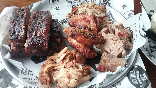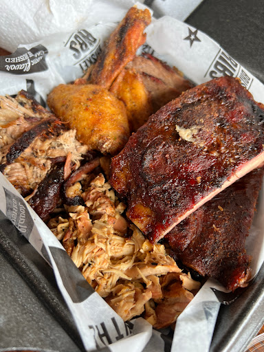 If you like dry food, this place is for you. I had The Texas combo of ribs and brisket with sides of hush puppies and fries. My wife had a pulled pork sandwich. Our excitement for bbq and hush puppies quickly evaporated. Of the lot, the pulled pork was horrendously dry. I almost couldnt choke down the bite I tried. Brisket should fall apart but this was pretty dry with the only signs of promise lying in the fat. Amazingly, even the fatty part, which I normally love, had a mealy texture. The ribs were almost the same with the only bits of juiciness in the fat itself. The hush puppies were our last hope. They tasted like hush puppies but, get this. They were overdone and dry. Everything seemed like it had been sitting under a heat lamp for hours. On the bright side, my french fries were pretty good but then, Im not in the habit of paying $14.99 for fries. Well never set foot in this place again.