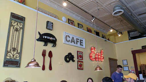 Love this place! Its exactly what a small town cafe should be. The food is always fresh and you can tell they take pride in their menu offerings. Theres a different flavored coffee everyday and youre always offered a fresh cup to go on your way out. The quirky paintings and wall hangings make the place feel like youre just at home hanging out. And the staff is beyond wonderful, in the humble opinion of a fellow server. The portabella eggs benedict is my go-to every time, and it never disappoints.