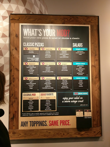 Mod Pizza offers a wide variety of toppings and sauces for pizzas and they dont charge per topping!! I am a very picky person so I really enjoy making my own pie and choosing as many toppings as i want. On top of that the staff is always energetic and friendly, its a favorite for my family and we come at least once a week and the staff even remembers our names!