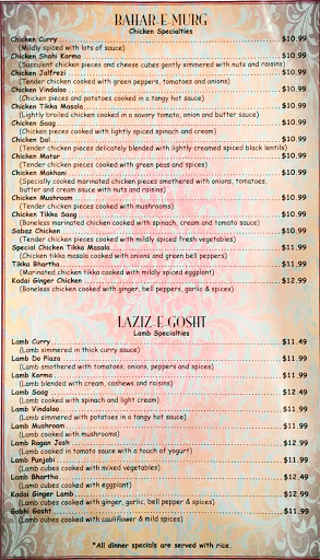We are new to authentic Indian cuisine and thought that Taj Mahals $7.99 lunch buffet would be a good way to try and learn. Great decision! The staff is very friendly and welcoming. The restaurant is very clean, with tables bussed quickly. There was a nice variety of dishes on the buffet. Everything was very tasty, with varying levels of spiciness (we happen to like spicy food). We will definitely go back and highly recommend it. Their take home menu has many, many dishes with very reasonable prices. Entrees are almost all under $15.