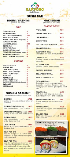 So, I used to hate sushi. My friends said that it was an acquired taste, that I would get used to the dead fish taste like I got used to beer. One of the reasons it is, in fact, hard to get an opinion on sushi is that many people have acquired a taste for bad sushi, marked by the fact that it tastes like dead fish. The Sapporo Wind, the ancestor of The Sapporo Sushi Factory, broke me of my hatred. Turns out, good sushi doesnt taste like dead fish at all. So, as I understand it, the owner of the Wind is the owner of the Factory and he is considered one of the best sushi chefs in the world. The open-faced sushi, by the way, should not be feared. It is called the Horo Special and it is delicious. The sushi chef at the Factory is experimental, and that is what sets him above and apart from others. Even his experiments taste like good, traditional sushi at their base. Having been to at least a dozen different chains including Mr. Sushi and Otani, I have to say that none of them give me that good food hum like the Factory. Customers are treated well and I like the simplicity and the comfort of the decor.