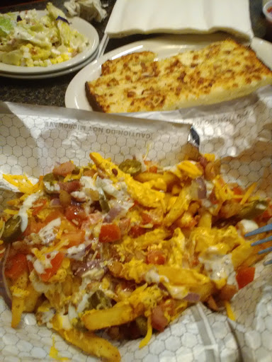 When we arrived, the 3 people working were all huddled together hanging out and didnt recognize our presence until my husband called out to them. I feel horrible for lady that works in evenings. My husband, parents, and I stopped in to eat while here for OK Arts Institute performance. My mother and I placed order of boneless wings of various flavors. When the waitress delivered drinks she asked if we would like to have our wings delivered with seasoning sauces on side and we could dip. We asked if they could please do that ahead of time in kitchen. Ive never had a wing place ask me to season my own wings. When she proceeded back to the kitchen, you could hear the cooks screaming at her about us and what we wanted. It was abrasive enough that I apologized to her that they were yelling at her over our order. Furthermore, my husband had to acquire ones set of our silverware, and he also refilled our teas as we didnt see a worker for over 30 minutes at one point. As we were leaving, my mother pointed out that there were about 20-30 dead cock roaches in the hallway in front of the bathroom and kitchen entrance. The pizza was fine, but they did deliver our wings with nothing on them. When we sent them back, the guys in the kitchen really had a fit.