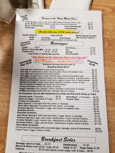 Great country cooking, good country atmosphere, friendly service, decent prices. Fantastic mushroom omelettes. Excellent chicken fried steak. Wish I could eat there every evening but alas old age pensions dont stretch that far.