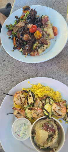 We ordered a shrimp kabob, a steak kabob, a side of pita bread, one drink, and a side of hummus. Our total was about $34. A little pricey but the quality and quantity of food we received was worth it. The steak kabob was amaaazing and so well seasoned. The shrimp kabob was cooked very well but the zucchini was the star honestly. Both kabobs came with two sides. I got roasted vegetables and a potato salad. My partner got roasted veggies and rice pilaf. The potato salad was not really my cup of tea but other than that, everything was great! They have an outdoor patio available so we may come here next time with our dog! Overall, a little pricey for lunch but service was polite and fast, and the food was delicious. Great for vegetarians or anyone who appreciates vegetables.