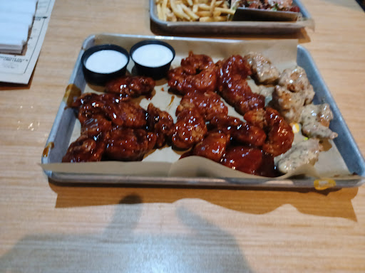 I have been to this place several times. The food is below average. The majority of the wait staff is criminally under-trained. Most of the time your order will be wrong or forgotten. You have to flag the staff down for everything, they will check on your table once, maybe. Every order other than wings will not have the sauce put on; it will be in a little cup for you to pour on yourself. There is no silverware, everything is in paper boats with plastic forks. If you order a beer it will take 15 minutes to get your table and you can forget about a refill... (Especially on 50 cent wings night, you will have to shout them over). The wings are dry and cold most of the time, anyway. If you just want to pound beers in the bar and watch sports... this place is "ok". There are plenty of places to do that in the area with better service/food. Patronize at your own risk.