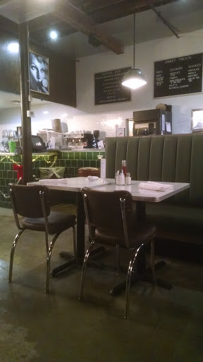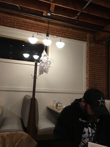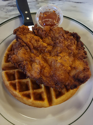 Visiting from SLC Im always wanting to go where the locals go and Im lucky to have friends who can drag me away from the hot dog food truck across the street and into the waiting arms of Dilly Diners comfortable fare. We started out with a cinnamon roll with cream cheese frosting. Removing the outer, slightly burned parts of the cinnamon roll revealed a tender bun slathered in rich and tangy cream cheese frosting. Next, we split a generous portion of the chicken and waffles, the star being the Sriracha honey you absolutely must drizzle over the top. The chicken was moist inside and held its crunch perfectly. The waffles were a little tough, perhaps a flour/batter tweak would help. The coffee was delicious and our waiter was attentive and not over or under serving. I loved the letter board signage, subway tiles and soda shop fixtures. My only regret was not ordering the biscuits and gravy! Therell definitely be a next time for that.