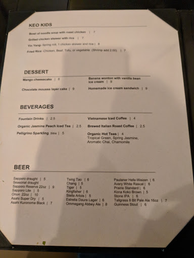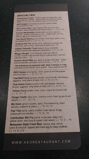 I absolutely love Keos curry dishes, including the curry wontons. The prices are fairly high, but the food is excellent.