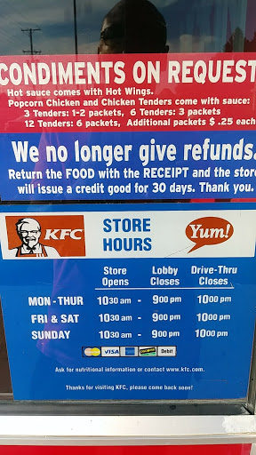 This is by far the worst KFC ever. They are very rude and the food is never right. Today my girlfriend went and got our family food. When she got home she realized they did not even put chicken on her chicken sandwich, they was fried chicken skin with almost no meat. On top of that it was very old and almost black in color. She decided to go have them replace the order. On her way she tried to call them with no answer. When she arrived all of the employees but one where out smoking. She made the comment to the girl inside that they wont answer the damn phone and was then refused service because she "cussed" at them. Really. She then asked for the manager that proceeded to start a fight with her. The manager was a man. He refused to help her, giver her his name nor the name of the gm or the number to corp. They are crooks and i will no longer give any KFC any business and will in turn go to popeyes or churches. Do no go here they are rude, crooks and management does not care and condones it.