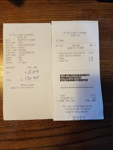 TGIF Fridays on 41st street has long been one of our favorite restaurants in Tulsa (we live in Skiatook). Unfortunately, this place has taken a dive into deep water. We had a party of 22 for lunch back in December. We had called ahead of time with the number in our party. That experience was a disaster. The young waiter struggled from start to finish. He appeared to have had NO training in terms of service. It took a long while just to get drinks. It took a long while for him to take our orders. It took a long time to get our food. From the time we arrived until the time we received our food, more than an hour had passed. Unacceptable. The food was a tremendous disappointment (at best) from one end of the table to the other. The server did not come around to check for drink refills. It was just about as bad a dining experience as you could imagine. To top it off, the server struggled with settling the bills. It took way too long to get everyone tabbed out. In my case, he claimed that he had trouble getting Stripes points for our purchase. All in all, it was a horrid experience. But we are forgiving and decided to give it another try. On Monday of this week we met a couple for lunch at this same location. It was pathetic. To begin with, we asked for a large booth on the east side of the restaurant. The gentleman who seated us said that "There are already names on those booths". We made two trips to the restrooms while there and there was no one in any of those booths. Boo bad. We were lied to. The server was terrible (never offered refills on soft drinks). One of the four meals was unacceptable (steak). One in our party had to ask for half of his order which was left sitting back in the kitchen. When she brought it out, she flopped it on the table and said that it just didnt get brought out with the rest of the meal. She offered no apology, no offer of comp, and was simply flippant about the whole thing. As a result of these two outings, we will not be returning to this TGIF Fridays. This place has some SERIOUS ISSUES including horrid service and poor level of food quality. It is too bad because we have so many pleasant memories of this establishment going back many years. The servers were always so good and the food was outstanding. That is no longer the case. We would not recommend that anyone choose this restaurant for their dining experience. Randy McGoffin
