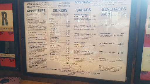 I had never eaten here until a few months ago. My wife, mother and I were out shopping, and we decided that some fish and chips sounded like a great idea. Having heard that the Depot was *the* place to go for fish and chips, we headed over. The menu was small, mainly being breaded/deep fried seafood. Not a problem, seeing as that was what we expected and wanted. But being charged $9.95 for the small plate of shrimp and fries was a bad sign. Then, the plate came. I normally like my salad cold and crisp, so having it intermingled with my fried food wasnt a good sign. Nor was the fact that the small plate came with 4 shrimp! The quality wasnt bad, but not *that* good. I am planning to avoid the Depot in the future, and would not recommend it to anyone who wants value for their food dollar.
