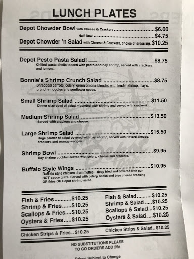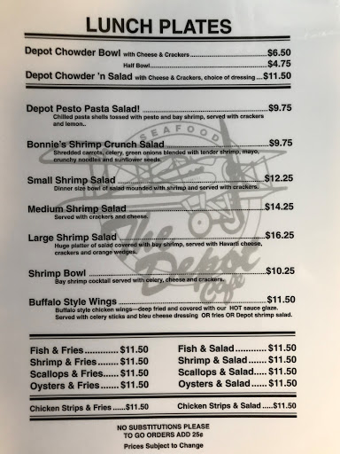 We have had very positive experiences at The Depot. The first time there, I ordered a "medium" shrimp salad; there was so much shrimp on it that I had to take some home! My husband tried their chicken wings and rated them as Wonderful. Since then, weve tried their seafood and have never been disappointed in either the quality or the quantity of food.