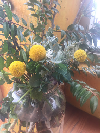 Blueberry cream cheese nested in a delicate Organic French pastry, cloth napkins, pint glasses for filtered tap, strainer in the pot tea, soft genteel music, handmade flower lamps, sealed crumbled cement, glossy sheen pine tables-chairs and yet everyone not talking 5 Apples one droid tap tap under the paper cut outs strung as Himalayan prayer flags. Magazine Rack!