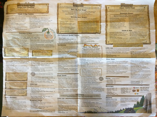 My kids love this place! They are 3 and 5 and they get so excited when I say "Who wants Black Bear?"! They have very generous portions of American comfort food and breakfast is served all day. I had the Fish and Chips with their scratch made tartar sauce and started off with a salad with a side of Caesar and scratch made Thousand Island. The salad was fresh and crisp and the dressings were very tasty. The Fish and Chips was quite good as well. Came out hot and crispy and has beer battering which I prefer. The kitschy campy decor is cute and fun, it was very clean, and for a nice casual and comfortable dinner its a fun experience. The service was very good as well which I really appreciated, our waitress was so nice. My children enjoy their kids menu and coloring crayons. I like that they have plenty of choices for kiddos and they have cute little cups with lids. Black Bear Diner is a wonderful family-friendly place for a yummy relaxed meal with cute bears and great service.