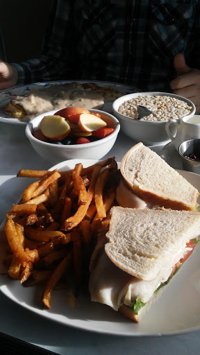 I think Ive found my new local dont-wanna-cook alternative. The meatloaf I had this evening was perfect. The mashed potatoes were obviously made from real potatoes and not flakes; there were still some lumps and they were tasty. The rolls are made on site and I overheard the waitress explain that the coffee there is ground fresh daily. My friend had the raisin french toast and he really swept his plate to finish every last crumb. The service was good and the atmosphere was pretty much vintage diner. I recommend this place for anyone who wants good food served pleasantly but with no pretension (pretty near negative pretentiousness.)