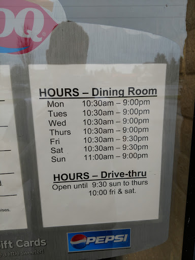 Went in tonight around 8:30 pm, yes, I know it is close to closing time but you kids working there need to be a little more attentive. We ordered our food (and your water cups.. well, thats just the dumbest thing Ive seen a restaurant do. My husband ordered a drink with his meal and yall want to charge close to $2 and then give me a 3-5oz cup for me to have water because I dont like Pepsi products! Shame on you! Then look up and see some food that needs to be picked up but no one is saying any numbers, finally my husband walks up there and it turns out its our food.. now Im just really disappointed in this DQ.. then we ordered some ice cream, a Salty Carmel Blizzard and a Hot Fudge Sundae, I took a few bites and I asked if he (hubby)would take a bite because it was kinda a different taste, he said his was the same, like it was mixed with whipped cream, wasnt the best but still ate it. We live about 2 miles from there and by the time we got home, hubby was sick, then it dawned on me, it was like the ice cream had been melted and then frozen again. So needless to say, we wont be going back and its going to be a long night in our household.