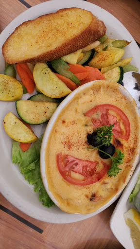 We stopped in here for our seventh wedding anniversary. We shared dessert here ten years ago after getting engaged on the beach. Ten years later its only improved. I ordered the ribeye steak, I ordered it medium since Im pregnant. It was perfect, tender, flavorful, perfectly seasoned, I could fully taste the steak not the seasoning. The fresh asparagus was lightly cooked, it was so good! My husband and I traded a few bites, he is super picky about steak but really enjoyed it. My husband ordered crab casserole, it was amazing!!! Im so glad he ordered it, hes even happier than me, it was that good. Avery generous portion of crab, topped with a delightful cheese sauce, they know what theyre doing! We would eat here again and again. We DEFINITELY recommend it!