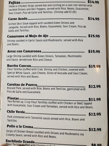 My husband and I couldnt decide what to eat. We had a coupon book that included one for Fajitas. We decided to check it out at 8:45 pm, 15 minutes before closing. Even though we were that late, they still invited us in and told us to have a seat. Perfectly polite and welcoming. We ordered the regular burrito and the Cancun burrito. My regular burrito was amazing, very delicious and under $6. My husband had the Cancun. Crab, shrimp, and chicken, without the white sauce, because he doesnt like mushrooms. It was filled with shrimp and crab and paired nicely with the chicken. It was a little pricier at $13.95, but it was worth it. The whole experience was very unexpected for a little place but we were pleasantly surprised. We will definitely be returning.
