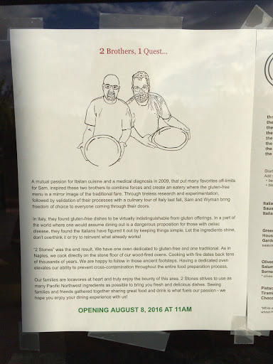 Oh my gosh. If you havent eaten at 2 Stones, sad for you! Very authentic Italian food. My favorite is Forager pizza, combo of wild mushrooms, truffle oil finished w fresh arugula. Its the best combination of flavors. The wood fire ovens and highest quality ingredients make the best crust. Its not a typical pizza joint, its well, ya gotta try it. Husband, Bob, loves the pasta. All house made from sauce to sausage. Im not gluten free but if u r, the full menu can be ordered. Sam, Wyman, Din and staff go above and beyond to make sure all is just right. I guarantee you will think you are in Italy not Oregon.