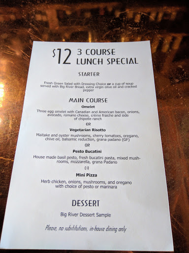 With everything on the menu being local and seasonal, its hard to go wrong. The chefs at Big River do magic with their food; everything is cooked perfectly. Its such a gem, having farm-fresh ingredients put together perfectly by obviously skilled chefs! Ive never had a disappointing meal here. And the desserts.... well as soon as you walk in the door youll see them and know theyre to die for. If you go in this season, I suggest the pan-seared halibut! Sooo good!