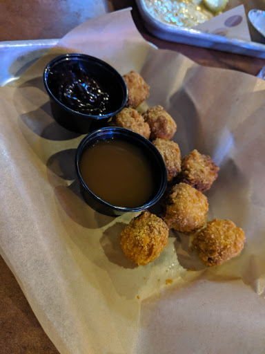 I went in after the lunch rush around 1:30pm and it was still crowded. They were placing larger groups outside in the patio area. I was with a party of 3 so we were seated near the bathrooms between two tables with children under 12. Drinks came quickly with the appetizer of onion rings. The sauce they brought with them was different than expected but very pleasant, and the onion rings were good even without sauce. I ordered the Bayou Po-Boy mostly because Ive eaten them in New Orleans and wanted to see how it compared. It was a soggy, falling apart mess. The bun was filled with cole slaw and two large chicken pieces were placed on top with sauce poured over it. Lifting it out of the tray impossible without two hands, not because of the size, but because of how sloppy it was, and my hands were both coated with the juice from cole slaw. The chicken fell off because you couldnt close the sandwich around them. So I just ate a cole slaw sandwich, washed my hands. Then come back and ate the chicken with a knife and fork. The fries were something you could get at McDonalds. Nothing special. I gave 3 stars only because the other food that came was less of a mess than what I was served.