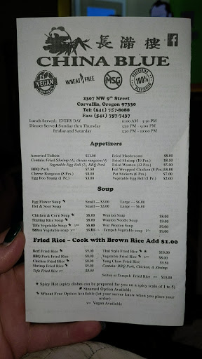 Was just there for lunch today. Last time I went, the place was under different management, still had the grumpy waitress, etc....and the food was not very good. Am happy to say I now have a much better opinion of the place. Had one of the lunch combos, with General Tsos chicken and Sweet and Sour pork, with fried rice and hot and sour soup. The General Tsos was worlds better than it used to be. Good, crispy breading, and an absolutely wonderful dark sauce...extremely tasty!! The S&S pork had a nice, light, crispy breading...with a really good and tasty sauce with lots of pineapple in it. The fried rice was a very light, sticky rice style with lots of egg....good for soaking up the sauces. The hot and sour soup was also very tasty and piping hot(temperature). Portion size was very healthy(I probably could have taken a small bit home had it not been so tasty), and all for just $9. Excellent deal! Corvallis is not known for a good selection of Chinese dining, but my lunch today at China Blue was very encouraging. I will definitely go back to try some different dishes. Really good meal, today, imo.