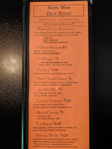 Happy Hour 3-6 and 9-Close. Best priced chicken basket for 4$ with amazing homemade sauce. Combine that with a 4$ pint of great beer during happy hour and it makes for a great experience with friendly staff and atmosphere.
