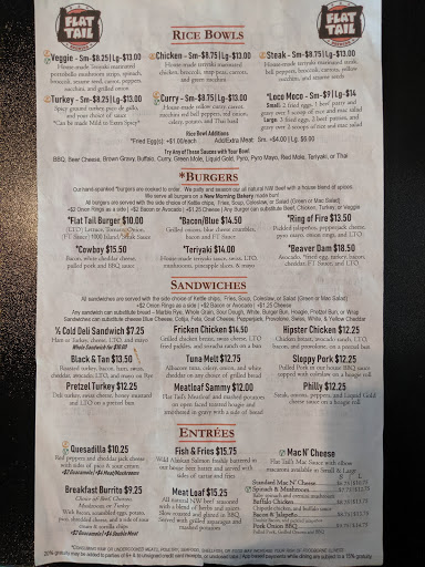 Ive never had something I didnt like here. Beer is great. Burgers are great. Fries/tots are great. Salads are wonderful. The only problem with Flat Tail is that there isnt a good place to wait for a table when you have to wait and wait service can be a little slow/understaffed.