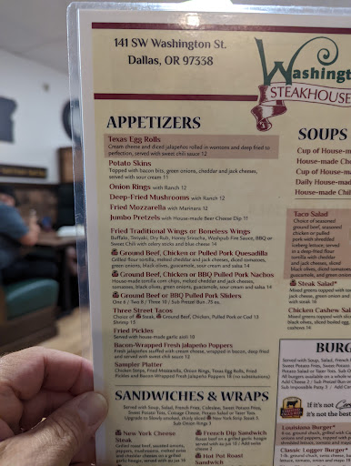 Washington Street is the place to stop if you are in Dallas. The menu has a good variety, and the price is right. The food is great and the staff is pretty friendly. I love good barbecue and this is what they serve. Everything else is good but if you go to the steakhouse and order pasta, its going to be not as good as the meat. It is still good though. Overall, it is clean, the pub is separate from the restaurant making it nice clean and family friendly. The tots are the best ever.