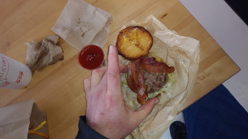 So, I ordered a plain bacon cheese burger with a dry bun and fries. I get back home and opened my burger and saw they forgot the cheese that I paid for. I then moved on and tried the fries. They were good tasting but had several that did not seem freshly made at all, even though I ordered when they were fairly busy. I started to eat my burger and the middle was not cooked well to the point that when I bit into it, bloody juices came out the other side. For waiting 15 minutes for an undercooked and uncompleted burger and subpar fries, I am disappointed. I would recommend five guys over this establishment. The only positive food item from this visit was the bacon.