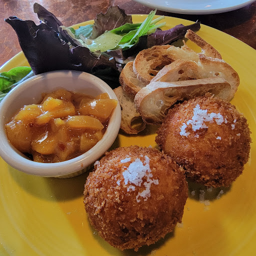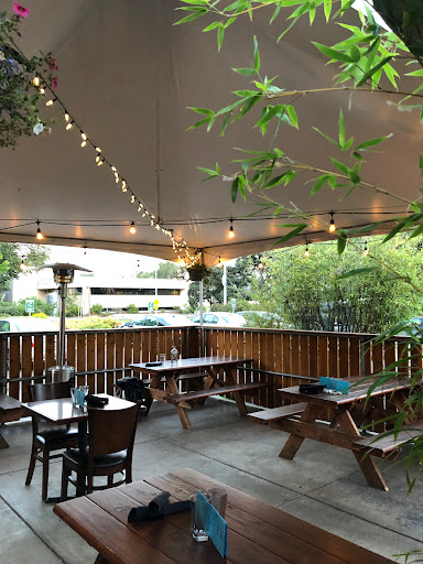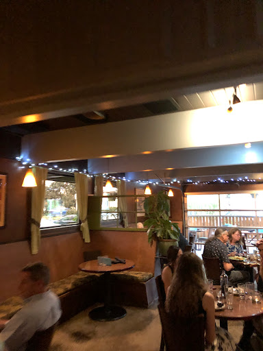 Lots of seating choices! Great N/A choices! Great location! Just a walk over the bridge f/Marriot! Fellow disc golfers work here! Great lighting inside & out! "Roomy" picnic tables out in elements! No waiting even w/o reservation! Beautiful food presentation to set off taste!