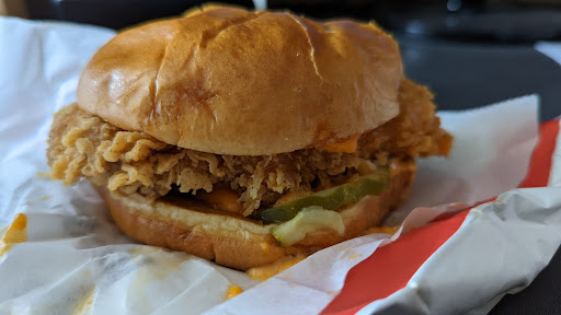Zinger sancwiches+ bacon/Cheese are on point. If you purchase more than 1 there usually made fresh. / went here last week. got #4 zinger sandwich combos. recieved 4 sandwiches with cheese and tiny pieces of bacon. horrible. could have cooked 4 or so more pieces of bacon.