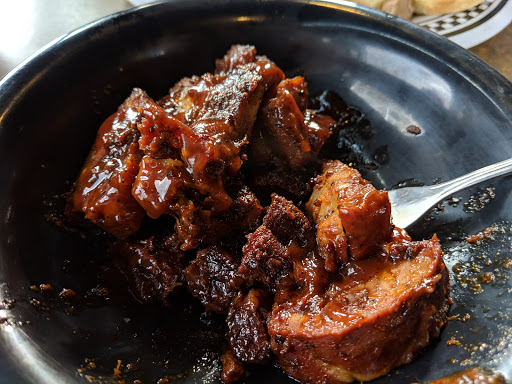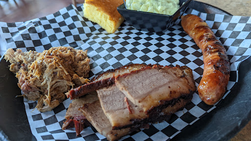 Brisket and Cheddar sausage. Mashed potatoes and jalapeño poppers. Brisket: Not bad. Flavor was pretty typical of what you would expect. Not sumptuous juicy, but, not dry as a bone either. Cheddar Sausage: Unless you have a strong jaw, its probably better to try a different kind of meat. It was difficult to cut and equally challenging to chew. The waiter knocked $5 off the bill when I showed him. Mashed Potatoes: They were whipped potatoes. Not bad flavor at all. If you are looking for a thicker more chunky mashed potato side, you can skip this one. Jalapeño Poppers: The four came out pretty good. Crunchy and done right. Pretty standard other than being bigger than average. Service: Attentive and friendly. The staff really was THE reason I went back and forth between 3 stars and 4 stars. Ambience: No frills. The tv was playing basketball with the volume off. The music that was playing ranged from "Redneck Woman" by Gretchen Wilson to "Eye of the Tiger" by Survivor. The speakers had no low end and hardly any mid-range and seeing as how it was being played loud enough to be heard, it was distracting rather than enjoyable. Overall: I think if the owners were willing to put money into the place settings (ie: quality forks and knives), a real stereo and more than one little tv, it might make sense as a restaurant. It felt more like an upgraded cafeteria than a BBQ joint. The food, while not bad wasnt anything to make a trip out of your way for. The sauces were good, but it really was basic BBQ food. If you happen to be in the area and have a yen to spend $20 (+$2.50 for soda) for 2 meats and 2 sides, go for it. Portions were good for 1 person to get really stuffed, but not quite big enough to split with a friend.