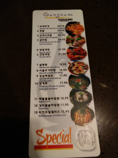 My wife is Filipino and Im American. We watch alot of Korean movies and drama. The more we watch, the more we are curious about Korean culture and cuisine. We wanted to try a real Korean BBQ with table top grills for our wedding anniversary. After researching online, we decided to try Gangnam Korean BBQ. It was amazing. I will post some pictures later. If I recall correctly, they also have a full menu of Korean food, but we were there for the do-it-yourself bbq experience. Our waitress took our order; you can choose from a variety of different meats youd like to grill. She returned with trays of fresh meat and vegetables to grill, along with sauces. The spicy pork is amazing. They also bring you a variety of side dishes. Im no expert, but it seems that having many side dishes is paramount in Korean culture. Our favorite was the pickled radish. Sliced thin, naturally pink,with a mild flavor. It looked something like beets but was actually radish (not the radish you think of that are common in American groceries). Dont be afraid to order pork belly. Pork belly is common in Filipino cuisine as well, so Im used to seeing it on menus and on the plate. Americans eat pork belly all the time - but its cured and called "bacon". Just like bacon, you can vary the "fattiness" by how long you cook it. Unlike bacon, its not salty or smoke flavored, so you may want to dip it in a sauce. Bottom line; youve got to try this place. If youre Korean, you probably know better than I do how good this place is. If youre not Korean: the next time you cant decide where you want to eat out - try this place. Its not just the food, but a quiet atmosphere with very friendly employees. Since our visit to Gangnam House, we visited another Korean bbq house in the greater Portland area which had a different atmosphere altogether. Loud music and dark lights. While not bad, we prefer the quieter atmosphere of Gangnam.