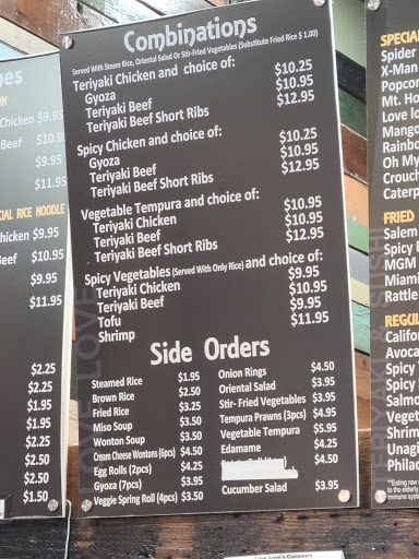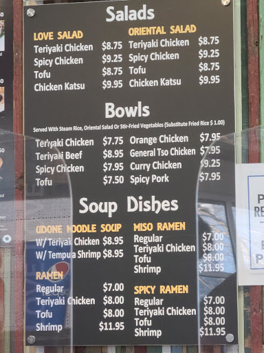 Love me my Love Love Teriyaki! This place has the same prices youd find at any Chinese takeout, for example, but the atmosphere is much much better. It is really classy inside, but still comfortable. The food has been very consistent. Always satisfied with the quality. There always seems to be a small line, so apparently lots of people like this place. Friendly service. Ive eaten here many many times, so I think I have a pretty good idea of what you can expect, and youll like it.