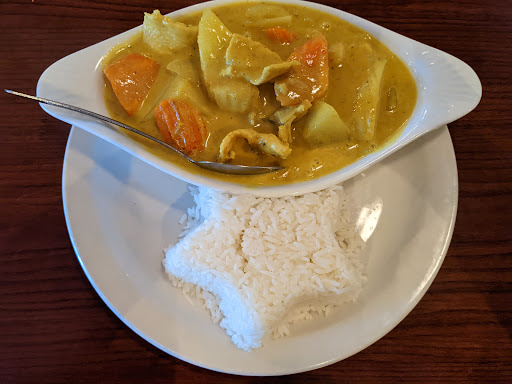 For the price, which is low, this is pretty good Thai food. Ive eaten their curries dozens of times, and theyre tasty, but the quality of the coconut milk they use is not very good. Try the murgh mukani (yogurt chicken with rice) or the pad thai.