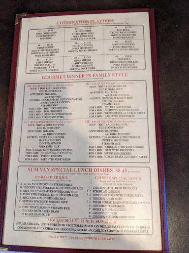 Delicious. Very tasty food, for reasonable prices. Not much for atmosphere, but the food is great, especially if one steers clear of the buffet. Nothing wrong with it, it just seems to me that the food tends to taste a little better if made to order. Could be just me, but that has been a consistent perception. Regardless, Sum Yan is worth a stop.