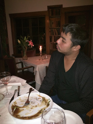 While the manor has old world charm, it is dank, dark, and musty inside. The carpets are ancient and dirty. We hesitated about eating dinner because of the musty old house smells, so decided to have a drink out on the deck (only to be told they dont have their liquor license to allow us to sit out there). The $10 happy hour priced mixed drinks (gin and tonic and margarita on the rocks) were subpar, but we sipped them and walked about the place and perused the menu. Lots of small rooms upstairs were set up with nice tables for dinner yet one side room had a table cluttered with papers and obvious old take-out food containers and dirty plates (clearly visible from one of those small dining rooms). The descriptions in the menu makes the food sound amazing, and for the prices we expected it to be amazing ($27-$58 range for entrees). We decided to give it a try. Sadly, we were extremely disappointed with our meals. The beef stroganoff was described to be made with filet mignon, mushrooms sautéed with shallots, and light cream sauce. The meat was NOT as described and tasted like previously frozen, overcooked, and slightly rancid long strips of mystery meat. The mushroom sauce tasted like it was out of a can. The chicken cordon bleu wasnt any better - it was dry and flavorless, the black forest ham was chewy/rubbery, and some parts of the breading were soggy while other parts were burned. When we asked about wine options, we were told there wasnt a wine list but the waiter listed a few options including a malbec, which we ordered. He came back shortly and told us they didnt have any of the options he originally told us about, then struggled to list what the current options were. We ended up ordering the pinot noir, which, sadly again, was subpar and overpriced. This was the most overpriced, unsatisfying, horrible tasting dinner weve had at any Portland area restaurant. We struggled to give this a one star rating (which was for the old world charm and peaks of the Willamette River through the trees).