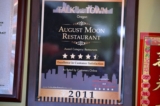 Consistantly good. Portland is a town that loves its Thai/Vietnamese/Cambodian, etc, so after moving here it took quite a while to find good Chinese. Now, there are many kinds of Chinese food, and Im pretty picky. I prefer the San Francisco style, which is not authentic Chinese from China but there you have it. Its what I like, and its what I finally found at August Moon after a long, sad search of almost a year. These are the flavors I grew up on as a kid and are therefore my comfort food: lo mein, fried rice, egg rolls, and especially egg drop soup. This is the best egg drop soup in town, hands down. Its flavorful, the perfect consistency (not too watery, not too thick) and doesnt have extra "stuff" in it to mess with the utter simplicity of the soup. Weve also been pleased to find white meat chicken in a number of dishes, something very unusual in Chinese takeout (if youre going to deep-fry it and cover it with sauce anyway, why use the more expensive white meat, right?) They are always fast with sit-down orders and with takeout, but I wouldnt recommend getting delivery during peak dinner hours on weekends--they dont have many drivers and if someone gets lost the wait time can be much longer than quoted. I have no idea what one of the other reviewers was saying about a rude waitress--most of the staff dont even have a firm grasp of the language (hard to be a smart aleck when you dont speak the language well), and Ive always found them perfectly courteous