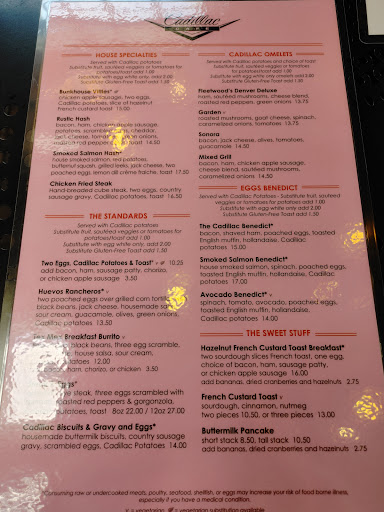 A favorite neighborhood breakfast and lunch place. Friendly, reliable, good freshly made breakfasts, nice bright atmosphere with big windows and clean decor. Its not a hipster place. Its been there for decades and attracts an older neighborhood crowd. The table service is professional but casual and friendly. Big enough that theres not usually much of a wait even on weekend mornings. The Cadillac isnt a hangout per se, but they usually dont mind if you linger awhile over your coffee and conversation after theyve taken your plates away. Theres a main room and a kind of "garden" room, which is much noisier. Ask to sit in the main room if you want to talk quietly or if you have hearing issues