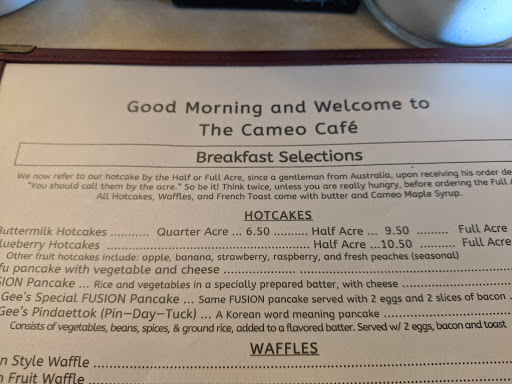 Im staying in a hotel nearby and read reviews on the cameo. The food sounded different interesting and intriguing enough I had to stop in to check out the cameo cafe and kimchee omelet! Other than the fact they close at three and Im often not out of the house till then or later, the food, service, owner, everything is wonderful. The coffee is the best too, one reason I stopped in again this morning to get a cup, and take breakfast home to the hubby. He is picky about his biscuits and gravy but I knew I could trust the cameo and he LOVED it. Thank you to the waitress for being so friendly! ( darkened)