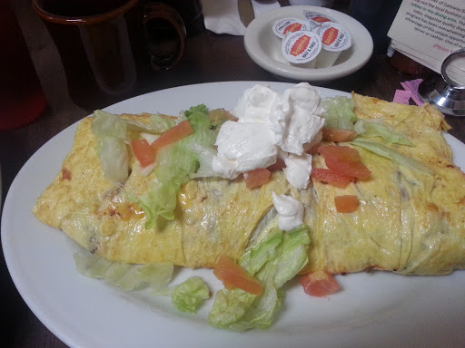 Recently ordered the taco omelet and when I mentioned to the waitress that it was gross she copped much attitude. So I explained to her that even if it is one of the most popular items on the menu there were hunks of raw onion in it as big as my finger and a pool of grease filled the plate from the bland and obviously days old ground beef. The whole place has a very worn, tired atmosphere (not in a charming way) and the place was filthy in every square inch. Absolutely filthy. Everywhere. Try to avoid the table under the leak in the roof and avoid the soup as it is left uncovered and god knows what falls into it through the hole in the ceiling directly over it. Prices are 1/3 higher than comparable places and the food is worse. Costs about as much as Sherris. Huge portions but the food is disgusting and wait staff will show there true colors if you have any complaints. First time will be my last time.