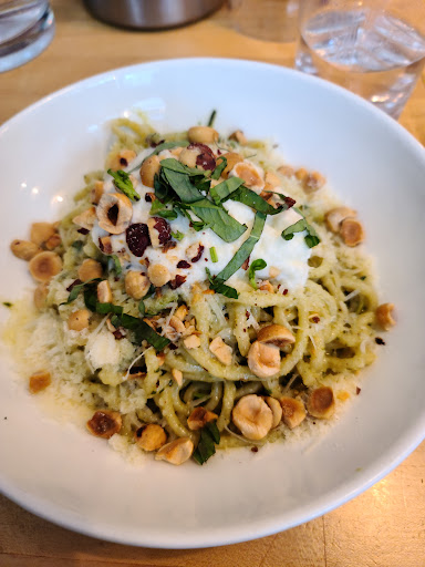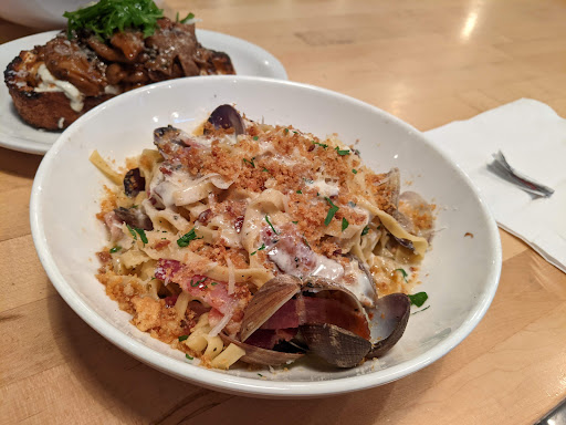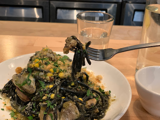Be prepared to hunt for a seat and be packed in when you find one because seating outs at a premium at this restaurant. Its popular, has good food and is still a novelty. All a mix for a crowd. All their pasta is fresh, made on premises and has such a could taste. The pasta dishes are all pretty trendy and unique. They all really sound intriguing. My wife and I got the calamari and I would pass next time. It was over cooked with to much breading. My pasta, the squid ink dyed with albacore tuna was very tasty and all at a reasonable price. My wife got the claim pasta. She really enjoyed it. Best part, the claims being fresh and the spices used in the dish. Very good place at reasonable prices.