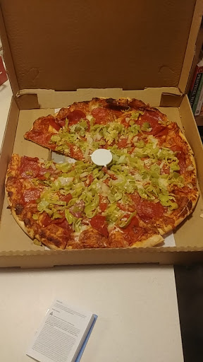 I love this pizza. Deck ovens make the crust so crispy. The pizza can be hit or miss with quality of toppings, however there are plenty of toppings. Its cheap and its locally owned. I usually get Canadian bacon, pineapple, mushrooms, olives, and crispy bacon! I would say that it gets a 8 out of 10 for overall pizzaliciousness!