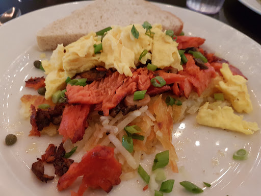 We waited to get seated on a Sunday at 11am. I had the corned beef hash. It was mostly hash brown potatoes with a few sparse chunks of nice tasting corned beef (horseradish sauce?) and bits of peppers and onions served dry. Came with one slice of toasted bread cut in half (Daves killer). There was bulk jam (fig, I think) on the table that was very good. Portion size was fine, but not like the portions and pure beef content at Biscuits cafe. My wife had hash browns with additions, which is a great option for vegetarians. The space is cramped and loud with background music that added to the noise level making it difficult to hear the conversation at our table for six. Prices were medium high and value was fine. I would go back if there is not a line to try something else that might be better. The flavors are inspiring. They need a bigger place.
