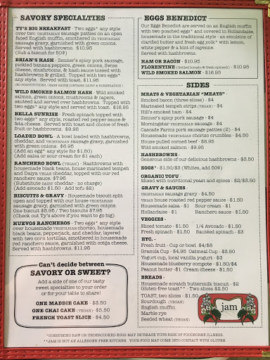 This has easily become a favorite of my wifes and mine. After she went there for an office breakfast, she told me we HAD to go. As a vegetarian, this is one of the best Portland restaurants we have been to. Almost all breakfast dishes are vegetarian, and many include vegetarian meats which are delicious. The last time we visited was on a Sunday morning. We knew it would be packed, but my wife assured me it would be worth a wait. After about 30 minutes, we were seated. By the time our food rolled around, I had completely forgotten about the wait. The Cheech & Chong scramble was incredibly tasty with the vegetarian chorizo, and my Tys Big Breakfast had great meatless gravy. Weve also had the Huevos Rancheros, which is so huge my wife ate it for 2 meals. Highly recommend! Its very tasty. Its hard to find breakfast food better than this. Honestly any other breakfast restaurant weve been to since has completely paled in comparison. We will be coming back here often. Have yet to try the lunch menu, but am looking forward to it.