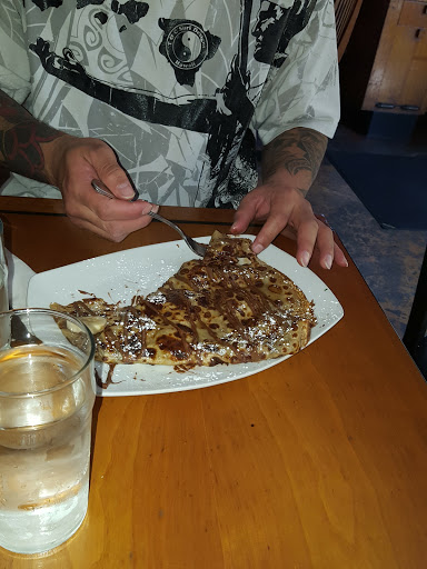 Im giving it two stars because of the service. Waiting for the crepes was long and to top it off, our waitress was rude and had an attitude. There was one waitress for 5 tables and she seemed to spend a lot of time in two tables chatting with the patrons there and forgetting about the rest of us. We needed a glass of milk for our son and after waiting several minutes for her to come by, my husband got up and asked her if she could bring us one. After waiting another ten minutes and seeing how she was just talking away at a table, my husband waited until she went back to the service area and asked her again for the glass of milk. This time, she responded in a rude way and when she eventually brought the glass of milk to our table, she dropped it on it and gave us a "Your welcome" before walking away. My husband was surprise about the attitude and commented on it, she came back to our table and began almost yelling at him. She left and made us wait another 20 minutes before bringing our dessert crepes (we had ordered them when ordering the main meal because we could see wait was long!) and refill our glasses of water. The main crepes were fine; the dessert ones were delicious! However, the service was so bad that we wont go there again.