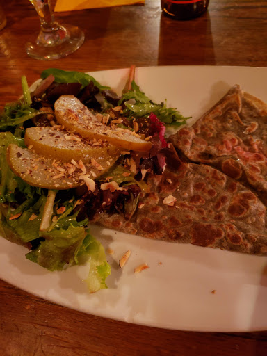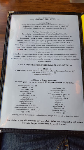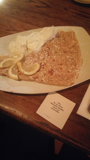 Adorable cafe dedicated to crepes. Its very cute and romantic in here - but our family of 7 still felt comfortable as well. I had a pear, gorgonzola and walnut crepe that was good - a little light on gorgonzola, but yummy. Youre able to add a small piece of steak to any plate for about $7 - it really is tiny, but if youre craving a little extra protein its enough for average appetites. Dessert crepes shine - giant nutella & banana crepes were a huge hit with my teens. Top off the good food with nice cocktails & great service - a total win for a date for couples, families or friends!