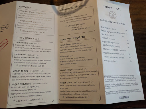 One of the best Ramen noodles I have in downtown Portland (in my opinion). If youre craving for some hot ramen noodles when in downtown, visit this place! They rotate their ramen specials everyday. They also have vegan ramen options for non-carnivores. I would recommend Tonkutso Red if you like spicy noodles. Now, I havent been to Japan so I cant say for certain if this is on par with Japanese standard of ramen. I heard from a friend of mine whos been to Japan and knows all things Japanese that their ramen is oily, and so it didnt pass his standard. However, if youre the type of person whos adventurous AND craving for some hot noodle during the cold weather in the Great Pacific Northwest, try Marukin Ramen!