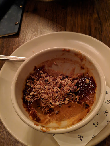 $36 for one diner 1. 煎茶 in a china cup and saucer (brisk) 2. Warm olives in good oil with rosemary and a couple happy drips of balsamic vinegar (unctuous) 3. Escarole salad in actual buttermilk dressing (light and delightful) 4. Braised lamb and its stock on polenta with capers, parsley, onion, harissa, and a raw egg yolk with crunchy good salt (combinations and sequences of taste, phenomenal) 5. Blue cheese (creamy, strong, mystical), red wine-stewed prunes (firm, chewy), toasted and crushed hazelnuts, half-toasted bread (hot and soft on one side, crisp and firm on the other) served on a board. Chilled oloroso sherry, recommended by the server, was an exquisite complement. The staff seemed actually happy to be at work, with genuine, ready, and uninhibited smiles. The whole could be described as grandly operatic if it werent so pleasantly simple. It was a superb meal, wonderful in its inventiveness and savor. Very appealing.